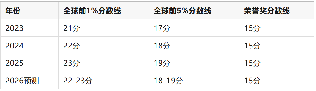 以下是近几年AMC8竞赛的获奖分数线参考: